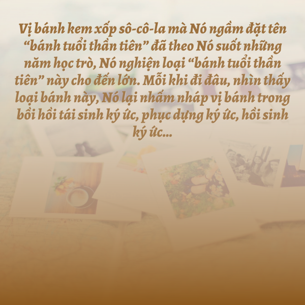 Vị bánh kem xốp sô-cô-la mà Nó ngầm đặt tên “bánh tuổi thần tiên” đã theo Nó suốt những năm học trò, Nó nghiện loại “bánh tuổi thần tiên” này cho đến lớn. Mỗi khi đi đâu, nhìn thấy loại bánh này, Nó lại nhấm nháp vị bánh trong bồi hồi tái sinh ký ức, phục dựng ký ức, hồi sinh ký ức…