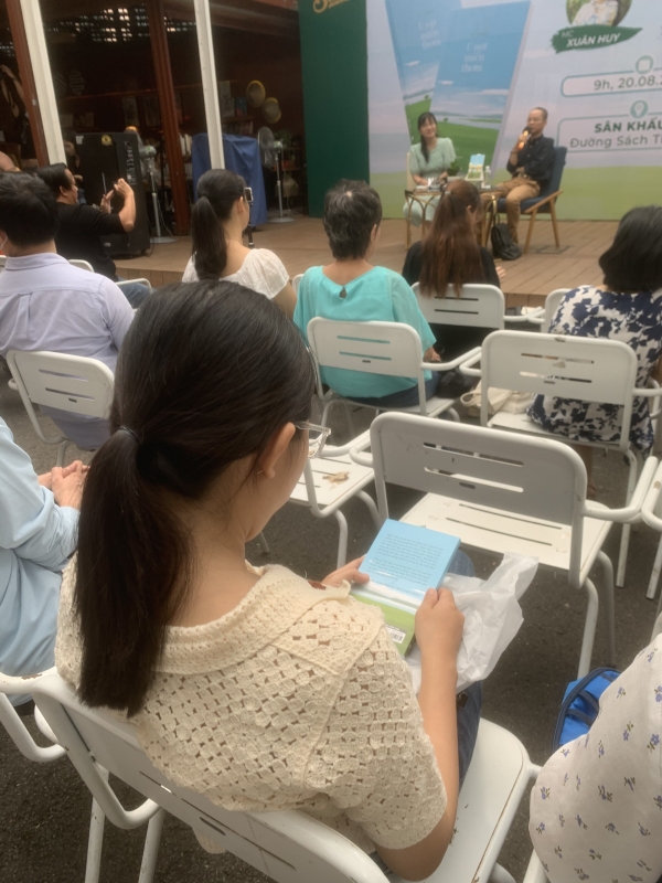 Tác giả (áo đen ngồi trên sân khấu) giao lưu cùng bạn đọc.