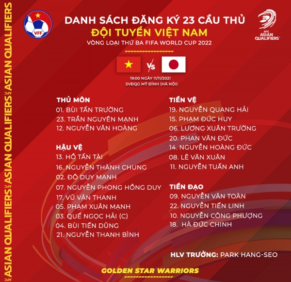 HLV Park Hang-seo đã công bố 23 cái tên tham dự trận đấu với đội tuyển Nhât Bản. Trong đó, đáng chú ý là sự trở lại của tiền vệ tài hoa Nguyễn Tuấn Anh. Anh được kì vọng sẽ giúp đội tuyển Việt Nam tạo được thế trận tốt trước dàn hảo thủ bên phía đội khách.