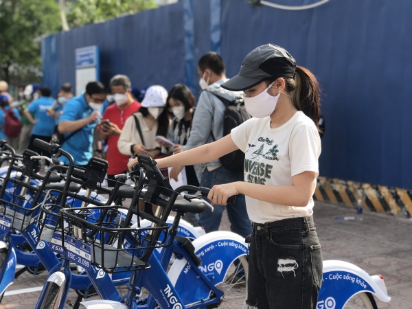Các bạn trẻ trải nghiệm xe đạp công cộng